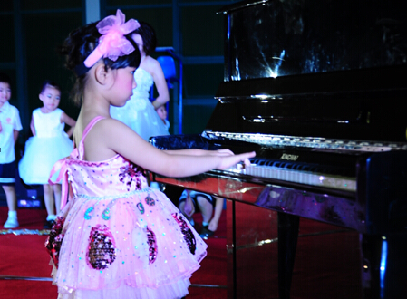 漂亮的钢琴老师与孩子们同台表演。