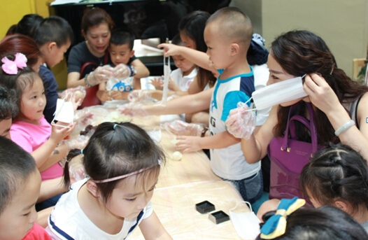 幼儿园孩子和家长在老师的指导下共同制作月饼。