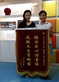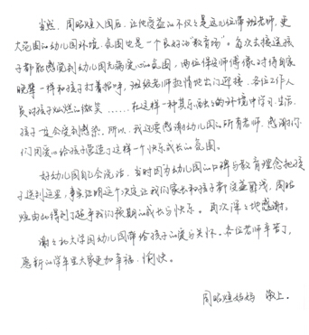 2014年8月25日,阳光明媚,北大学园幼儿园石家庄恒大城园中一班周昭烜家长给幼儿园送来了旌旗及感谢信,感谢幼儿园的良好教育风格,感谢班级教师的细心育儿。