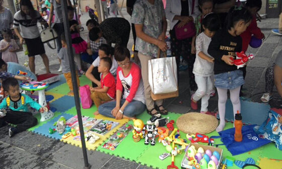 2014年9月27日,北大学园幼儿园郑州普罗旺世园的师生与家长们共同参加了物业举办的“歌舞浓情颂祖国,邻里和睦促文明”的迎十一社区文艺晚会。北大学园幼儿园郑州普罗旺世园的小朋友们献上了的精彩表演,赢得了阵阵掌声。另一方面,我园小朋友和家长在会场旁边举行的跳蚤市场活动也热闹非凡,温度已远远超过舞台上的表演,孩子们平时在区域活动里玩的游戏,今天在这里终于变成现实了。当孩子卖出一件自己的小玩具后,惊喜的大声告诉妈妈,“我挣到真的钱了”,快乐、成功、自信的感觉溢于言表,看着孩子们有的专注的询价买玩具,有的耐心的向买家介绍自己的商品,有的用自己的玩具和其他的小朋友商量交换,等等….都是那么认真和专注,这真的是一堂最好的社会实践活动课。