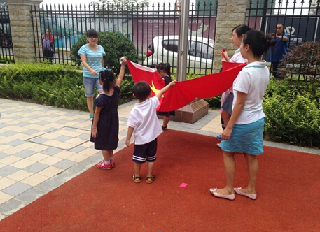 2014年9月15日,迎来了北大学园幼儿园成都恒大御景半岛园第一次升国旗活动。早上9点50分,集合音乐准时响起,穿着整齐的各班孩子们在老师们的带领下,整齐有序排好队伍等待着升旗仪式的到来。此时大家看到小司仪端正地站在国旗台边上,笑容满面,神采奕奕。4位升旗手护卫着鲜艳的五星红旗在安静地等候着,守卫着美丽的红旗。